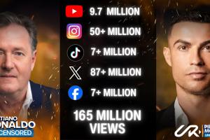 摩根与C罗的独家访谈于上周分两部分发布,分别上线于多个社交媒体平台,其中油管平台浏览量就接近1000万,全平台总观看量达到1.65亿。